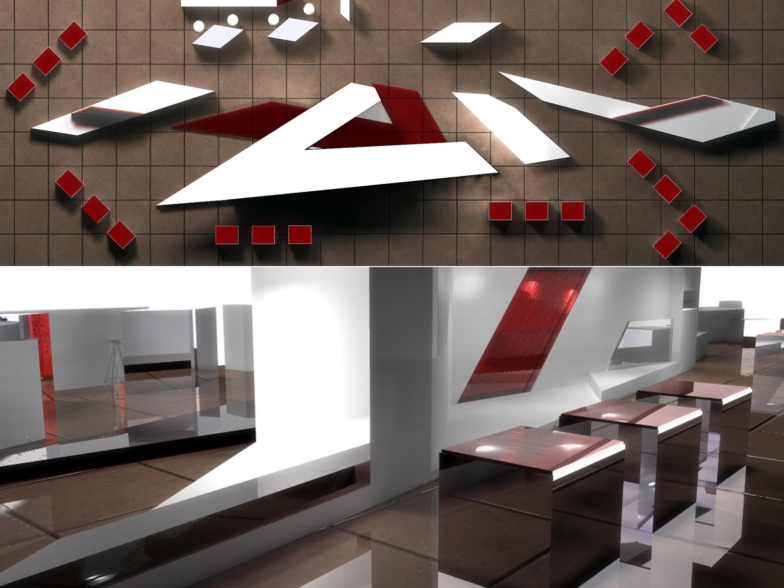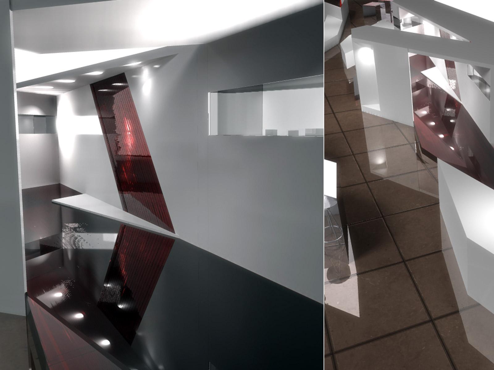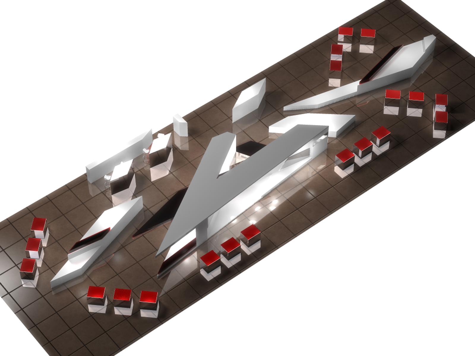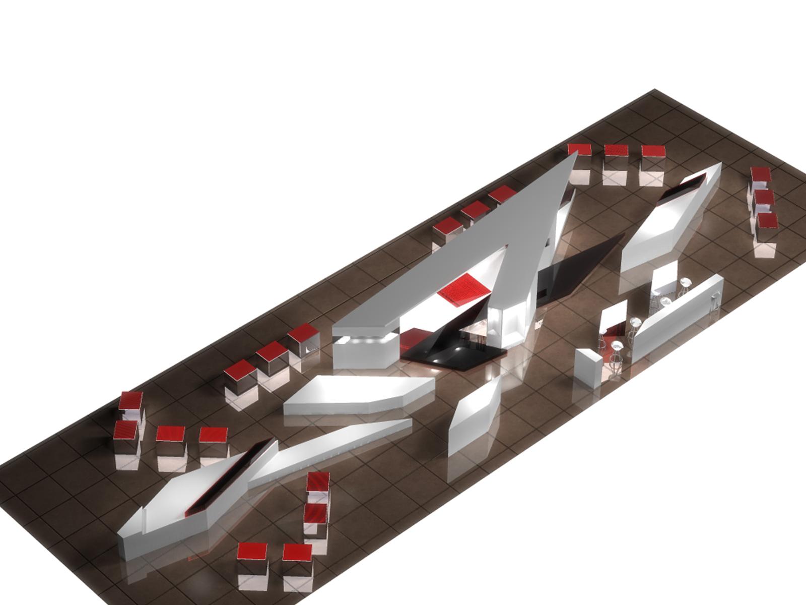 Έκθεση προϊόντων αυτοκινήτου. Σχηματίζει το γράμμα “B” του εταιρικού λογότυπου, ενώ o διαγώνιος σχεδιασμός της σχηματοποιεί τις εκθεσιακές περιοχές. Το σχήμα της, εμπνευσμένο από το εξωτερικό κέλυφος του αυτοκινήτου, καθορίζει μια συνεχόμενη ροή από διασταυρωμένες κινήσεις μέσα στο χώρο.